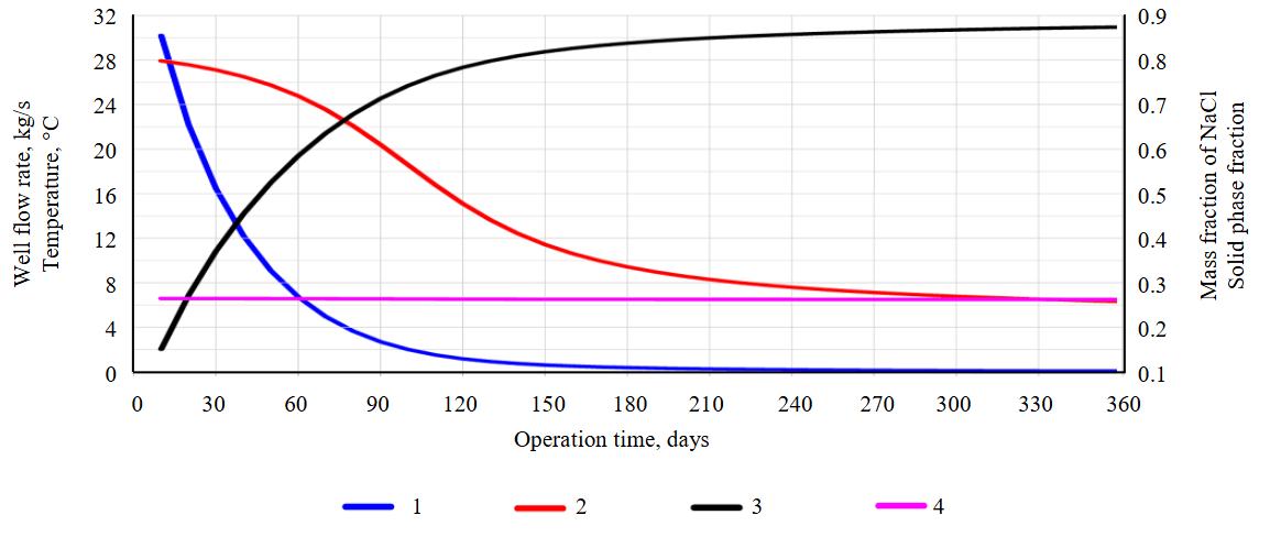 1 – variation of production well flow rate, kg/s; 2 – wellhead temperature, °C; 3 – volumetric fraction SS of filling the wellbore with NaCl solid phase; 4 – mass fraction of NaCl in the near‑wellhead section of the production well