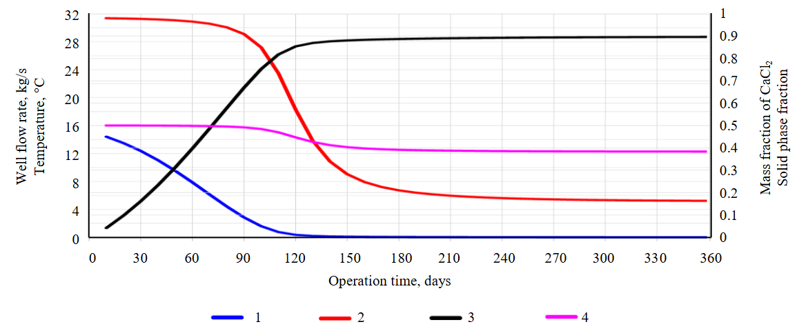 Simulation results with the initial parameters show that the well flow rate catastrophically drops from 2 kg/s to zero within the first week of operation, and the wellhead section becomes filled with antarcticite. The total production of CaCl2 is low, amounting to 207.6 t. When converted to lithium, this equals 237 kg, assuming a lithium mass fraction of 0.114 % in the initial brine mineralization. Therefore, test problem 4A was considered. In this variant, compared to test problem 4, the well productivity index was increased to 1.0·10–10 m3; the thermal conductivity of the enclosing rock formations was reduced to 0.1 W/m·°C.