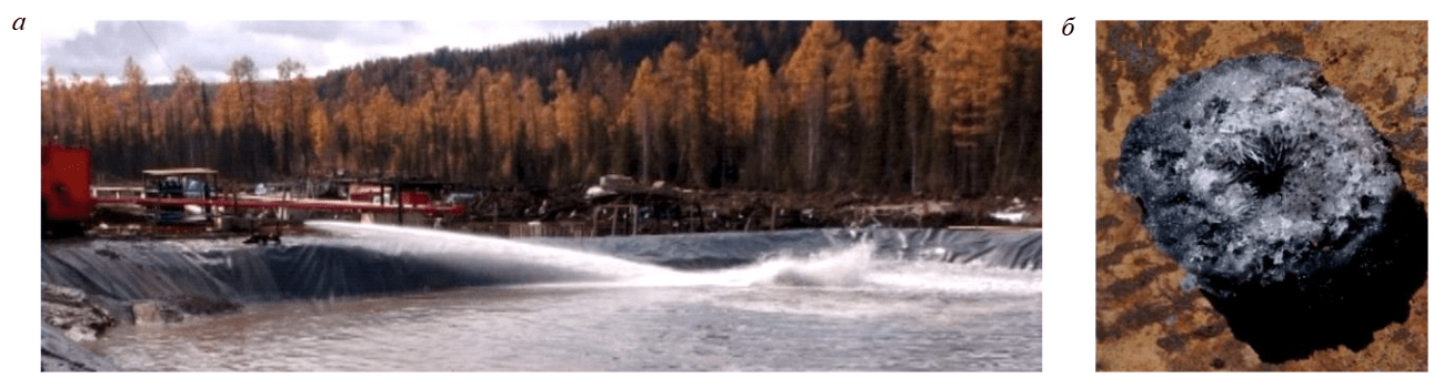 Рис.1. Ковыктинская площадь, Ангаро-Ленский артезианский бассейн: а – управляемое фонтанирование глубокой скважины, участок «Литий»; б – солевая пробка из бурильных труб, соли кристаллизуются при нарушении PVT-условий системы (фотографии предоставлены А.Г.Вахромеевым)