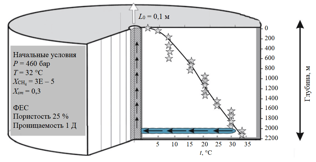 Рис.2. Концептуальная модель скважинной эксплуатации литиеносных предельно насыщенных рассолов, Ковыктинский участок, Ангаро-Ленский бассейн [31] Добычная скважина в асимметричной (RZ) системе координат вскрывает целевой резервуар на глубине 2 км; слева – информация о начальных условиях в целевом резервуаре и его фильтрационно-емкостных свойствах (ФЕС); справа – график изменения температуры с глубиной (звездочки) в покрышке вмещающих горных пород; стрелки – движение рассола из целевого резервуара и вверх по скважине; ХСН4 – массовая доля метана; Хsm – массовая доля соли в растворе