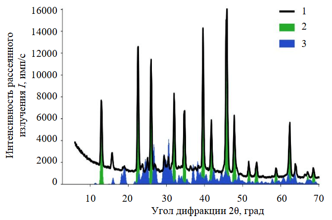 Минеральный состав солевого осадка, выпавшего при температуре около 20 °C, исследован с помощью рентгеновского дифрактометра MAX XRD 7000 (Shimadzu) в диапазоне углов гониометра от 6 до 65° 2θ с шагом 0,1° 2θ, скорость сканирования составляла 2 град/мин, что эквивалентно выдержке в точке 3 с. Съемка велась при вращении образца со скоростью 30 об/мин.