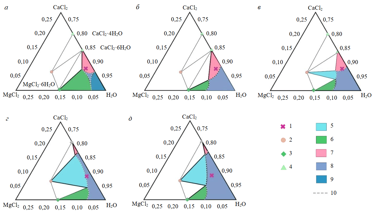 Рис.4. Схема фазовых отношений в тройной подсистеме MgCl2–CaCl2–H2O, температурные диапазон от –35 до 0 °C (а), от 0 до 20 °C (б), от 20 до 30 °C (в), от 30 до 40 °C (г), и свыше 40 °C (д)