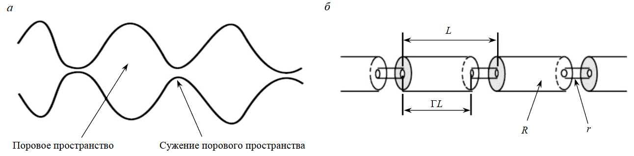 Рис.5. Модель для конвергентно-дивергентных (сжимающихся-расширяющихся) поровых каналов: а – концептуальная модель; б – серия последовательных трубок