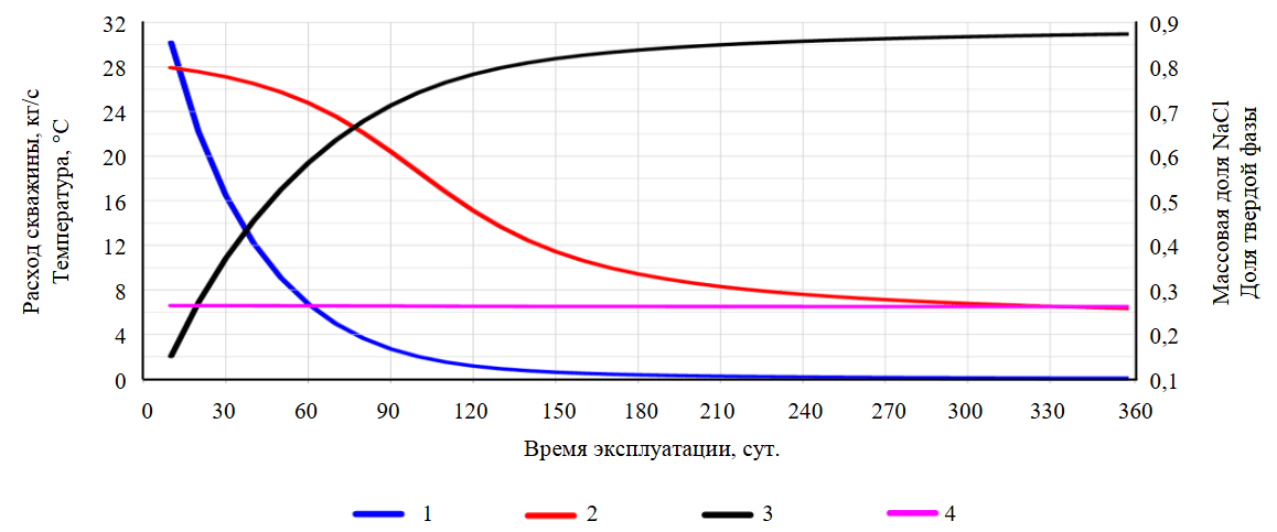 1 – изменение расхода добычной скважины, кг/с; 2 – устьевой температуры, °С; 3 – объемной доли SS заполнения скважинного пространства твердой фазой NaCl; 4 – массовой доли NaCl в приустьевой части добычной скважины