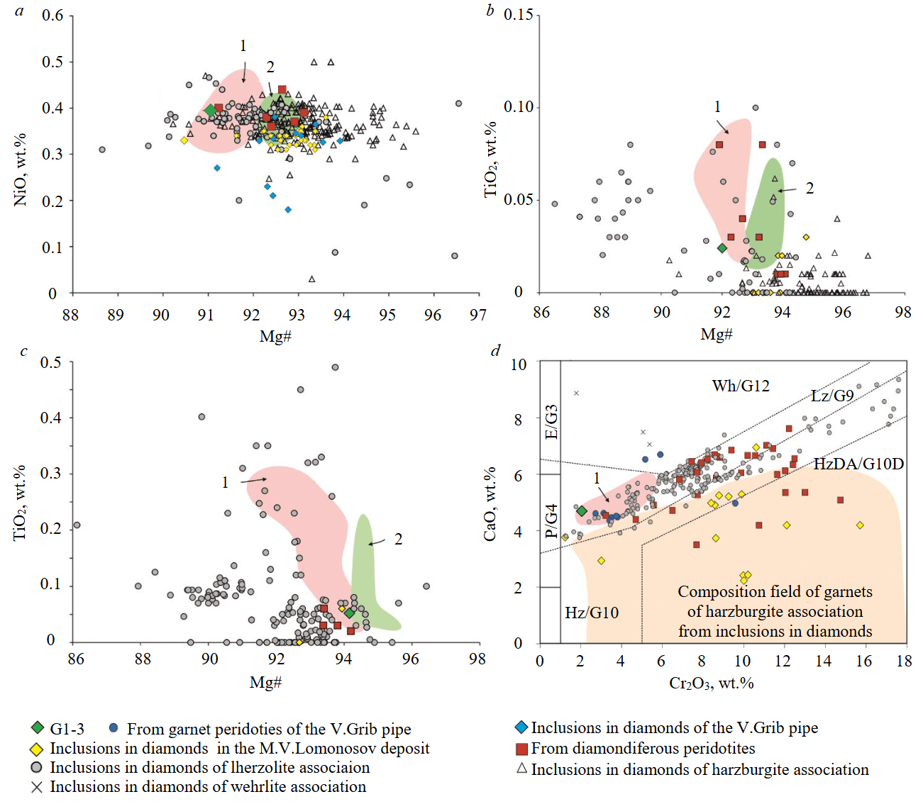 The results of the study of mineral inclusions in diamonds from kimberlite pipes of the M.V.Lomonosov and V.Grib deposits in the Arkhangelsk Diamond Province (ADP) [8, 9] lying in the northern East European Platform suggest that peridotites are the dominant substrate for diamonds with a subordinate role of eclogites [10-12], which is typical for most diamonds in the world [1]. Despite numerous comprehensive studies of diamonds from the ADP deposits [13-15], data on the concentrations of major elements in pyropes and Cr-diopsides included in ADP diamonds of the peridotite association are limited [8, 9], and data on the contents of rare elements were not yet obtained [16]. This does not allow to reliably establish the relationship between the stages of diamond formation and certain metasomatic events in the lithospheric mantle of the ADP [16, 17], to assess the thermal regime of the lithospheric mantle at the stages of diamond formation and to determine the range of diamond distribution depths [18, 19].