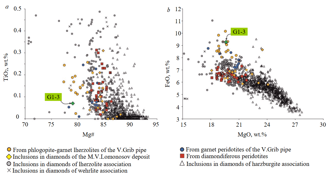 Calculation of the conditions of diamond G1-3 stay in the mantle, based on dependence of aggregation of nitrogen defect centres on annealing time and temperature [33], showed that when choosing an interval of 1-2 Ga, the annealing of diamond G1-3 occurred at temperature 1050-1090 °C (Fig.6, c). Isotope composition of carbon δ13C in diamond G1-3 shows an extremely low value of –18.59 ‰ relative to the VPDB standard (Fig.6 d). The available data on isotope composition of carbon in diamonds from the ADP kimberlite pipes (Fig.6, d) are limited by δ13C values from –22.1 to –2.9 ‰ for the M.V.Lomonosov deposit [34, 35] and from –9.6 to –2.8 ‰ for the V.Grib pipe [10, 12]. The vast majority of measurements lie in the range of middle mantle values from –8 to –3 ‰ [1]. The accumulated global database indicates the existence of a strongly lightened carbon isotope composition in diamonds from eclogites, down to δ13C values below –40 ‰, which is not characteristic for diamonds from peridotites [1]. Rare extremely negative δ13C values from –14 to –26 ‰ were recorded in peridotite diamonds from deposits in the Kalahari Craton (South Africa [1]) and the Siberian Craton (Russia [6]). A greenish secondary inclusion with Mg# 93.6 was found in diamond G1-3, identified using the Raman spectroscopy as lizardite (Fig.6, a). Mg# of this inclusion differs significantly from the rock-forming olivine (Mg# 91.1), but corresponds to Mg# of serpentine present in the rock.