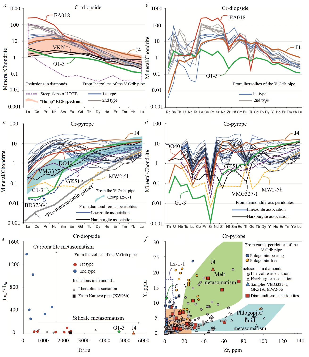 The influence of high-temperature melt metasomatism should, doubtless, be reflected first of all in the composition of Cr-pyrope, namely, in the enrichment in TiO2, Y and Zr [36]. Cr-pyrope of lherzolite G1-3 contains low concentrations of TiO2 (0.07 wt.%), Y (11.5 ppm) and Zr (1.2 ppm), which does not correspond to the compositions of garnets affected by melt metasomatism [1, 36]. Low values of Zr/Y (0.1) and Zr/Hf (21.4) ratios in Cr-pyrope (see Fig.4, f, 7, a [1]) together with low values of Lan/Ybn (26) at high Ti/Eu (4686) in Cr-diopside (see Fig.4, e) also exclude the influence of carbonatite type of mantle metasomatism.