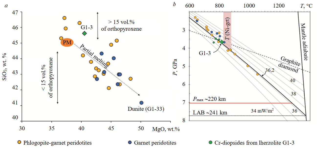 Fig.5. Specific features of reconstructed chemical composition (a) and calculated P-T parameters (b) of diamondiferous lherzolite G1-3 from the V.Grib kimberlite pipe. Reconstructed compositions of peridotites from the V.Grib kimberlite pipe according to [21]. Composition of the primitive mantle (PM) according to [28]. Approximation of geotherms according to [17]