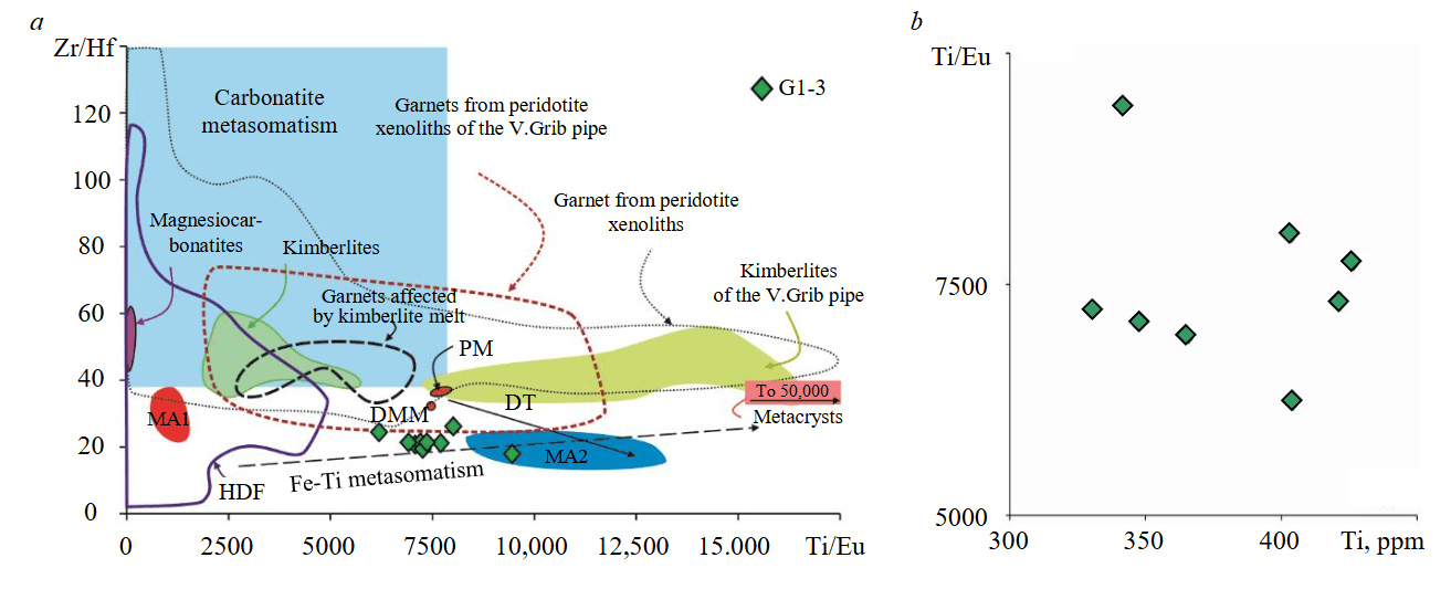 Fig.7. Zr/Hf to Ti/Eu (a) and Ti/Eu to Ti (b) ratios in all analysed grains of Cr-pyrope in diamondiferous lherzolite G1-3. Fields and trends according to [1]; kimberlites of the V.Grib pipe according to [16]; garnets from peridotites of the V.Grib pipe according to [22]; megacrysts of the V.Grib pipe according to [16]; garnets affected by kimberlite melt according to [41].