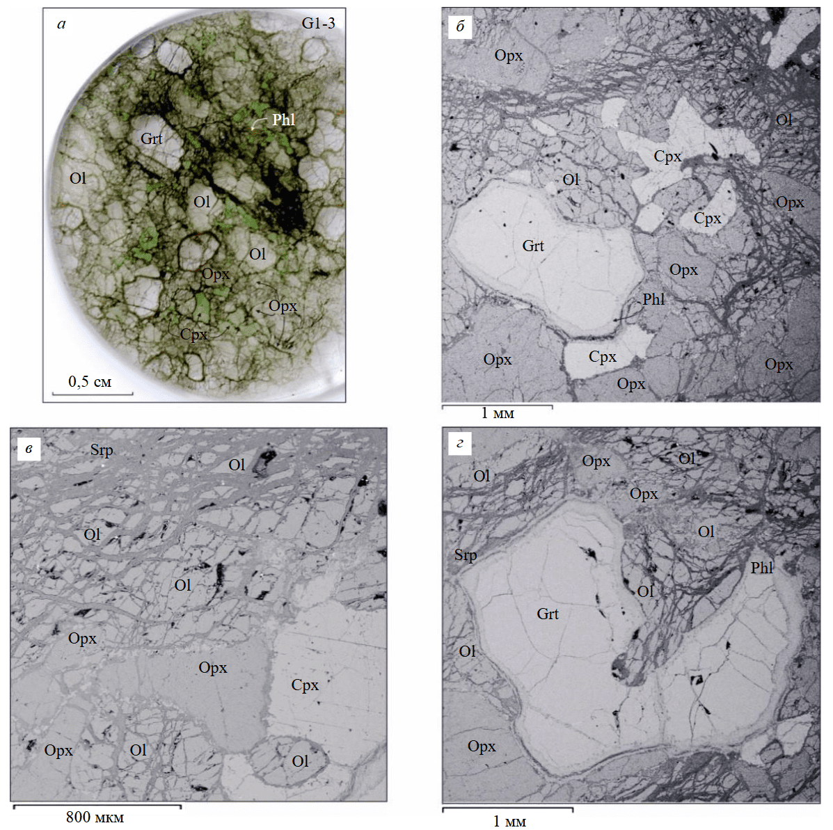 Ксенолит G1-3 представляет гранат (11 об.%) содержащий лерцолит, состоящий из преобладающего оливина (61 об.%), а также орто- (18 об.%) и клинопироксена (10 об.%). Лерцолит характеризуется крупнозернистой структурой, размеры зерен породообразующих минералов достигают 5 мм (рис.1). В образце обнаружен флогопит (< 1 об.%), который встречается как в виде отдельных крупных (до 2 мм) таблитчатых зерен (рис.1, а), так и в виде кайм вокруг зерен граната (рис.1, б, г). Зерна оливина пронизаны многочисленными трещинами, по которым развивается серпентин (рис.1). Все породообразующие минералы лерцолита однородны по составу без признаков химической зональности (табл.1, рис.2, 3).