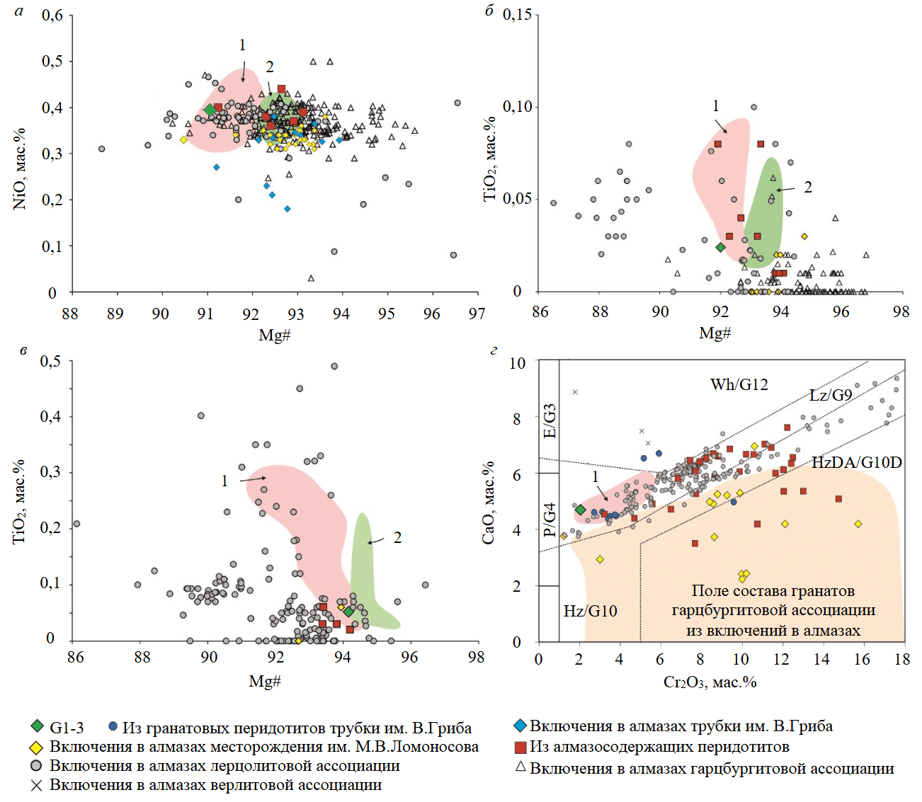 Рис.2. Особенности состава оливина (а), ортопироксена (б), клинопироксена (в) и граната (г) из алмазосодержащего лерцолита G1-3 кимберлитовой трубки им. В.Гриба в сравнении с перидотитами трубки им. В.Гриба [22], алмазосодержащими перидотитами из кимберлитовых трубок Канады [4, 5] и ЮАР [21, 23], из кимберлитовой трубки Удачная (Россия [6]) и лампроитовой трубки Аргайл (Австралия [7]), включениями в алмазах мира [1, 18] и ААП [8, 10, 11]. CaO/Cr2O3 диаграмма для гранатов [24] с дополнительными полями из [25] HzDA/G10D – гарцбургит-дуниты «алмазной ассоциации»; Hz/G10 – гарцбургит-дуниты; Lz/G9 – лерцолиты; Wh/G12 – верлиты; E/G3 – эклогиты; P/G4 – низкохромистые пироксениты