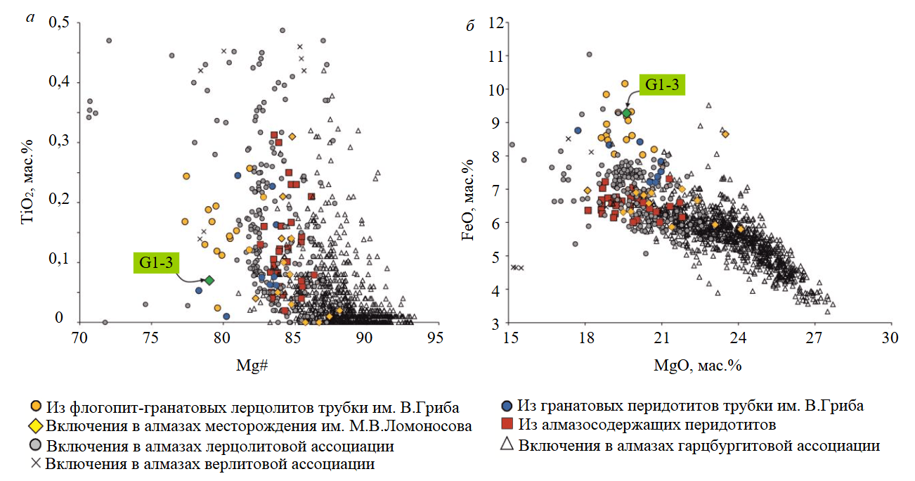 Оливин представлен форстеритом с Mg# = Mg/(Mg + Fe) × 100 = 91,1 и концентрацией NiO 0,4 мас.%. По составу оливин соответствует оливинам из флогопит-гранатовых лерцолитов трубки им. В.Гриба (см. рис.2, а). Значения Mg# оливина G1-3 соответствуют Mg# оливинов кратонных гранатовых лерцолитов мира (Mg#ср 91,5±1,2 [1]) и оливинов лерцолитовой ассоциации из включений в алмазах мира (Mg#ср 91,8±1,0 [1], см. рис.2, а). Значения Mg# оливина G1-3 ниже, чем для большинства оливинов из включений в алмазах из кимберлитовых трубок им. В.Гриба и месторождения им. М.В.Ломоносова (за исключением трех зерен с Mg# 90,5-91,6; см. рис.2, а), а также оливинов гарцбургитовой ассоциации из включений в алмазах мира (Mg#ср 93,1±0,9 [1]). Опубликованные данные о составе оливинов из алмазосодержащих перидотитов ограничены [5, 7, 21], так как в большинстве образцов оливин полностью замещается серпентином [4, 6]. Тем не менее, оливин G1-3 имеет идентичный состав с оливином из алмазосодержащего лерцолита лампроитовой трубки Аргайл [7] (см. рис.2, а).