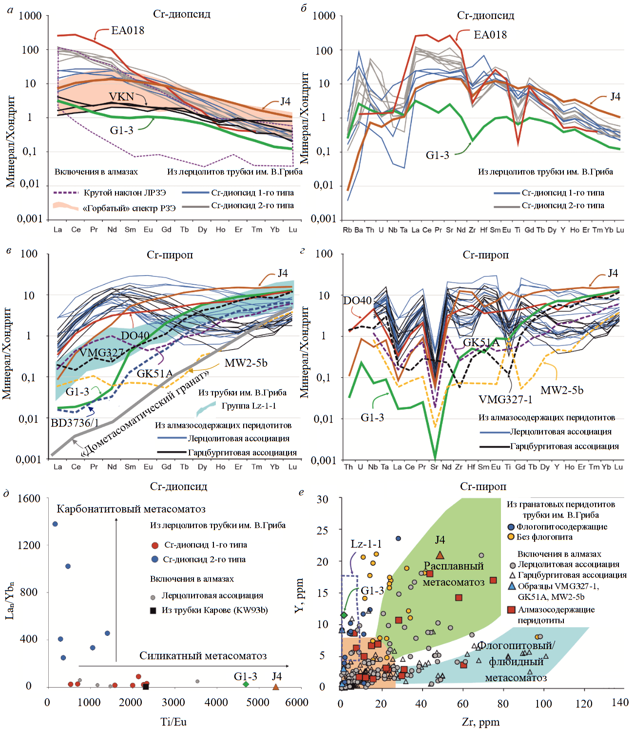 Влияние высокотемпературного расплавного метасоматоза, безусловно, должно в первую очередь быть отражено на составе Cr-пиропа, а именно – в обогащении TiO2, Y и Zr [36]. Cr-пироп лерцолита G1-3 содержит низкие концентрации TiO2 (0,07 мас.%), Y (11,5 ppm) и Zr (1,2 ppm), что не соответствует составам гранатов, испытавшим воздействие расплавного метасоматоза [1, 36]. Низкие значения отношений Zr/Y (0,1) и Zr/Hf (21,4) в Cr-пиропе (см. рис.4, е, 7, а [1]) вместе с низкими значениями Lan/Ybn (26) при высоких Ti/Eu (4686) в Cr-диопсиде (см. рис.4, д) также исключают влияние карбонатитового типа мантийного метасоматоза.