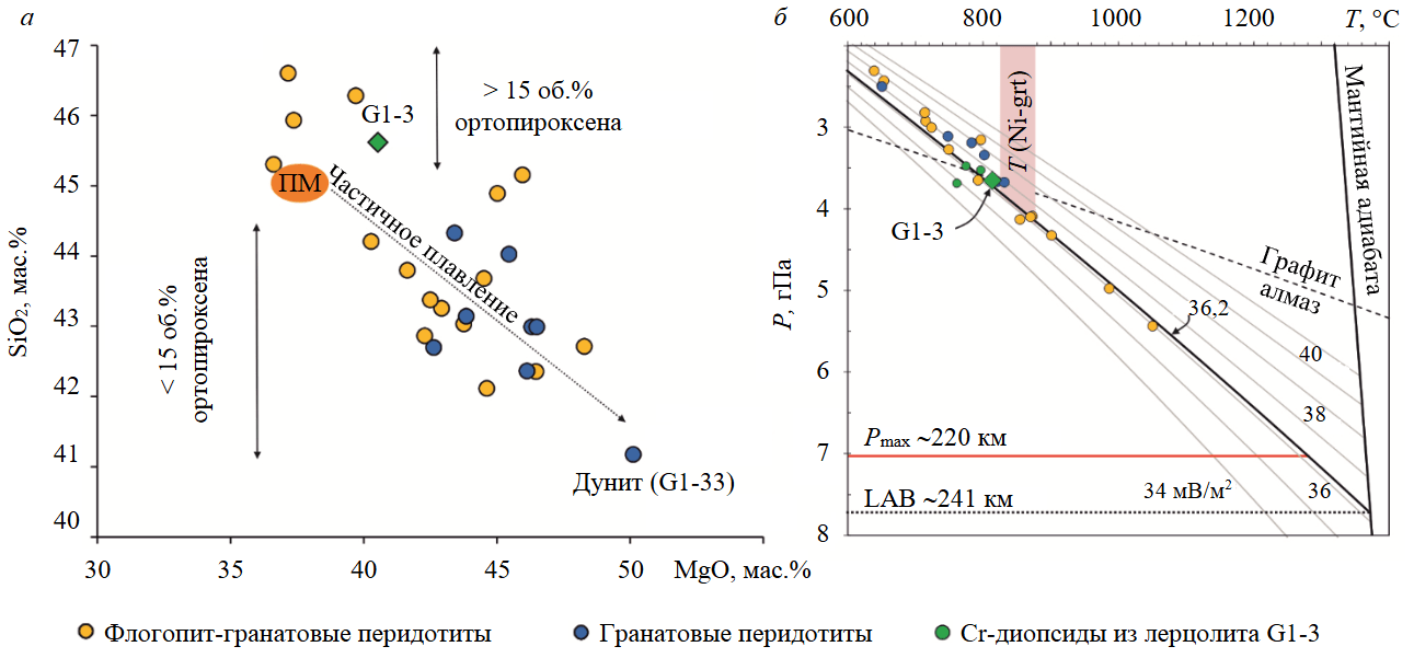 Рис.5. Особенности реконструированного химического состава (а) и расчетные Р-Т параметры (б) алмазосодержащего лерцолита G1-3 из кимберлитовой трубки им. В.Гриба. Реконструированные составы перидотитов из кимберлитовой трубки им. В.Гриба по [21]. Состав примитивной мантии (ПМ) по [28]. Аппроксимация геотерм по [17]