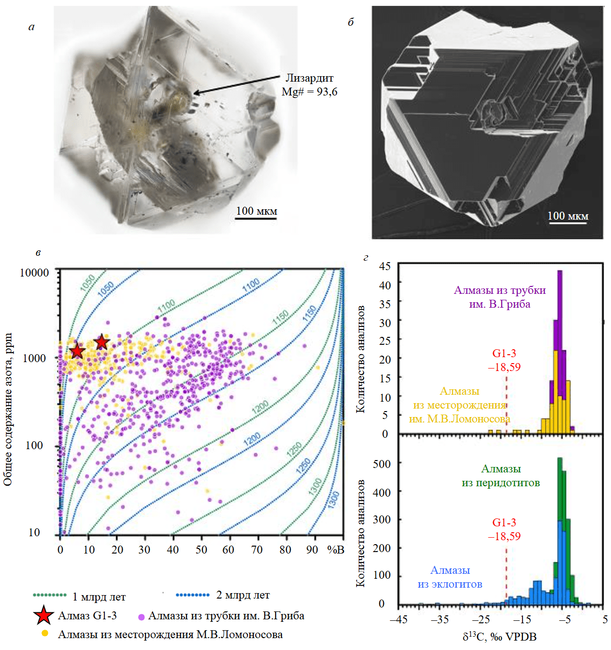 Расчет условий пребывания алмаза G1-3 в мантии, основанный на зависимости агрегации азотных дефектных центров от времени и температуры отжига [33], показал, что при выборе интервала в 1-2 млрд лет, отжиг алмаза G1-3 происходил при температуре 1050-1090 °С (рис.6, в). Изотопный состав углерода δ13С алмаза G1-3 показывает экстремально низкое значение –18,59 ‰ относительно стандарта VPDB (рис.6, г). Существующие данные об изотопном составе углерода алмазов кимберлитовых трубок ААП (рис.6, г) ограничены значениями δ13С от –22,1 до –2,9 ‰ для месторождения им. М.В.Ломоносова [34, 35] и от –9,6 до –2,8 ‰ для трубки им. В.Гриба [10, 12]. При этом подавляющее большинство измерений лежит в области среднемантийных значений от –8 до –3 ‰ [1]. Накопленная общемировая база данных указывает на существование сильно облегченного изотопного состава углерода в алмазах из эклогитов, вплоть до значений δ13С ниже –40 ‰, что не характерно для алмазов из перидотитов [1]. Редкие экстремально отрицательные значения δ13С от –14 до –26 ‰ зафиксированы в перидотитовых алмазах из месторождений кратона Калахари (южная Африка [1]) и Сибирского кратона (Россия [6]). В алмазе G1-3 обнаружено зеленоватое вторичное включение с Mg# 93,6, идентифицированное с использованием рамановской спектроскопии как лизардит (рис.6, а). Mg# этого включения значительно отличается от породообразующего оливина (Mg# 91,1), но соответствует Mg# присутствующего в породе серпентина.