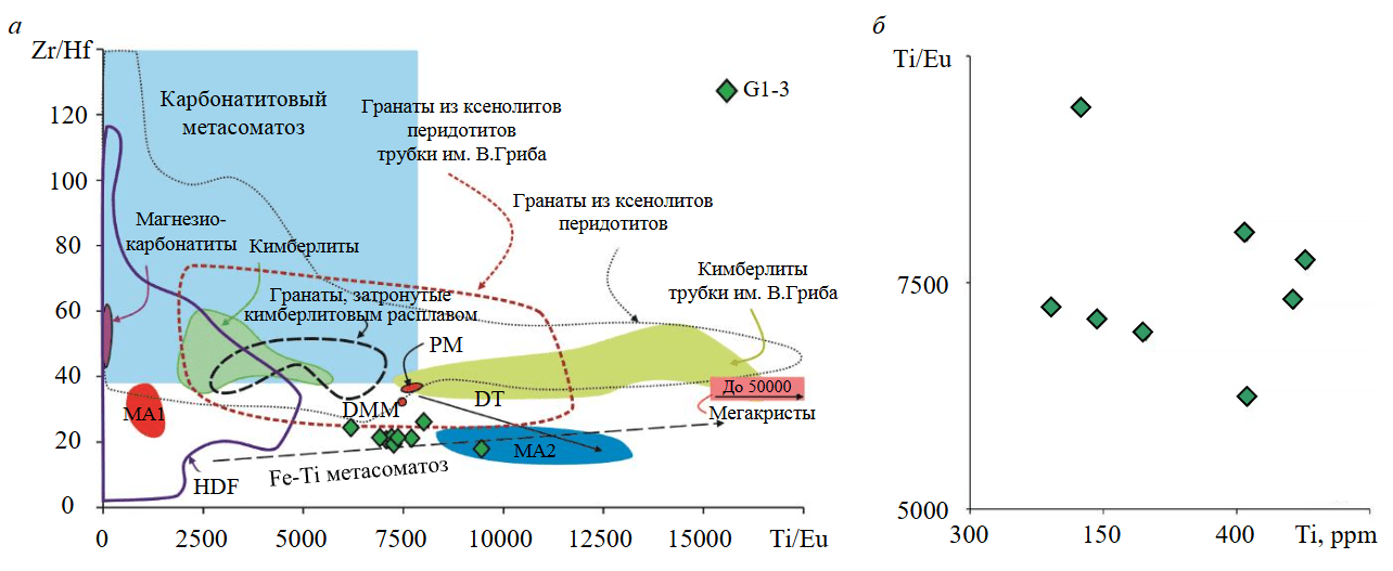 Отношения Zr/Hf к Ti/Eu (7400) в Cr-пиропе G1-3 не соответствуют значениям, определенным для гранатов, подвергшихся влиянию карбонатно-силикатного (кимберлитового) расплава (Zr/Hf 30-50 при Ti/Eu 2500-7000). На диаграмме Zr/Hf к Ti/Eu положение точек всех проанализированных зерен Cr-пиропов из лерцолита G1-3 маркирует области как вблизи тренда Fe-Ti-метасоматоза, так и параллельно тренду истощения расплава (рис.7, а). Отсутствие явной положительной корреляции между значениями отношений Ti/Eu и содержаниями Ti в Cr-пиропах G1-3 (рис.7, б), а также низкие концентрации Ti не позволяют сделать вывод о воздействии Fe-Ti-метасоматоза [39, 40].