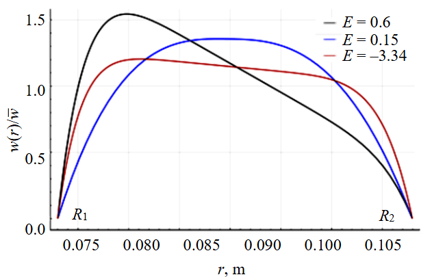 A minimum value of this parameter indicates the presence of the most uniform velocity profile. The use of program code makes it possible to obtain numerical solutions for the velocity profile. The corresponding modified excess coefficient characterizes the uniformity of the velocity distribution. For a more accurate visual assessment, the velocity distribution is plotted in a dimensionless form. This form represents the ratio of point velocity to the mean flow velocity – The plotting domain is located between the drill pipe wall R1 and the wellbore wall R2. Examples of velocity distributions and the corresponding values of the excess coefficient are shown in Fig.1. The most elongated and shifted profile corresponds to the highest value of parameter E.