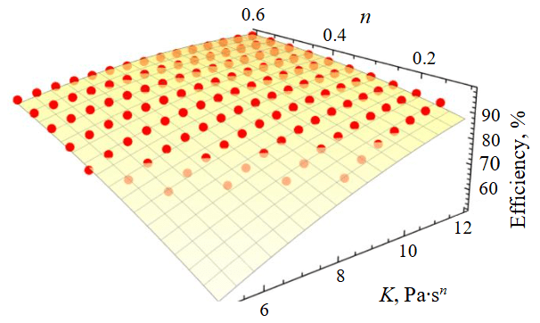 To determine the effect of the parameter combination of the Herschel – Bulkley model (1) on the uniformity of the velocity profile, it is necessary to establish the dependence of the modified excess coefficient E on the parameters τ0, K, n. Since E depends on the velocity distribution obtained from the numerical solution of the momentum equation with specified geometric conditions, pressure drops, and fluid parameters, the problem reduces to identifying the relationship among these numerical parameters. A nonlinear form of dependence is assumed: