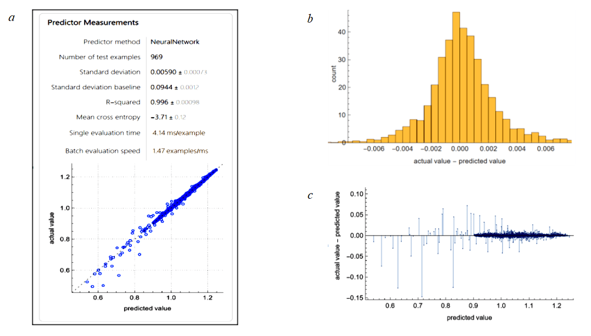 The values of the modified excess coefficient were calculated for each velocity distribution while varying the parameters τ0, K, and n under pressure drops corresponding to the critical flow velocity. According to the two-sigma statistical rule, profiles with the most uniform velocity distribution were identified with a probability of 95 %. A total of 4845 cases with cuttings transport efficiency greater than 70 % and n ≤ 0.8 correspond to the currently relevant formulations of drilling fluids. For these cases, the values of the velocity profile uniformity index were determined. The test was carried out for fluids with cuttings transport efficiency greater than 70 % and n ≤ 0.8. The next step was to determine the dependence of type (3) of the modified excess coefficient on the parameters of the rheological model. Based on the results of [24], it can be assumed that the relationship is nonlinear. Due to the multifactorial nature of the approximation task, a machine learning method selection template was used. The data were randomly divided into training and test sets in an 80/20 ratio. The input parameters were τ0, K, n the output parameters were the modified kurtosis coefficient E. According to the coefficient of determination, the Neural Network method in Wolfram Language proved to be the most effective for this task, with R2 = 0.996 (Fig.3). The distribution of deviations (Fig.3, b) also indicates the high quality of the approximation. Analysis of the graphs showed that deterministic sequences were identified for the modified excess coefficient starting from 0.9. Further consideration of the problem continues exclusively within this interval.
