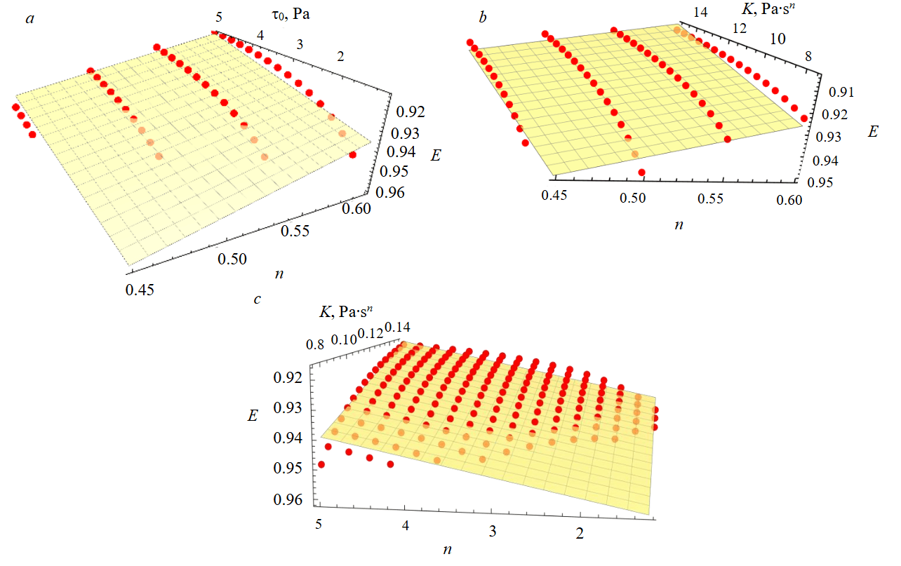 The graphs (Fig.4) show projections of the four-dimensional model (8) onto three-dimensional space at fixed values of the rheological parameters. The response surfaces provide an approximation of the initial data in the examined regions. Low deviation values and R2 = 0.83 are explained by the weak manifestation of nonlinearity in the vicinity of the response surface. Neglecting this minor nonlinearity, equation (8) can be used for sufficiently simple calculations. For the most uniform profile, E will assume the lowest values when conditions (6)-(7) are satisfied.
