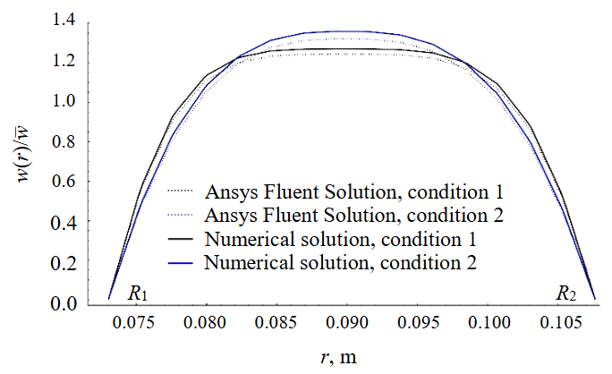 Research [24] compared the solutions obtained under the Newtonian fluid approximation with the analytical solution for Poiseuille flow in an annular gap. The physical adequacy of the numerical solution was confirmed when varying the input parameters. The numerical solution was implemented in Wolfram Language as an interpolating function that enables velocity values to be represented as a function of the coordinate. In addition, a numerical indicator of velocity profile uniformity, referred to as the modified excess coefficient, was introduced: