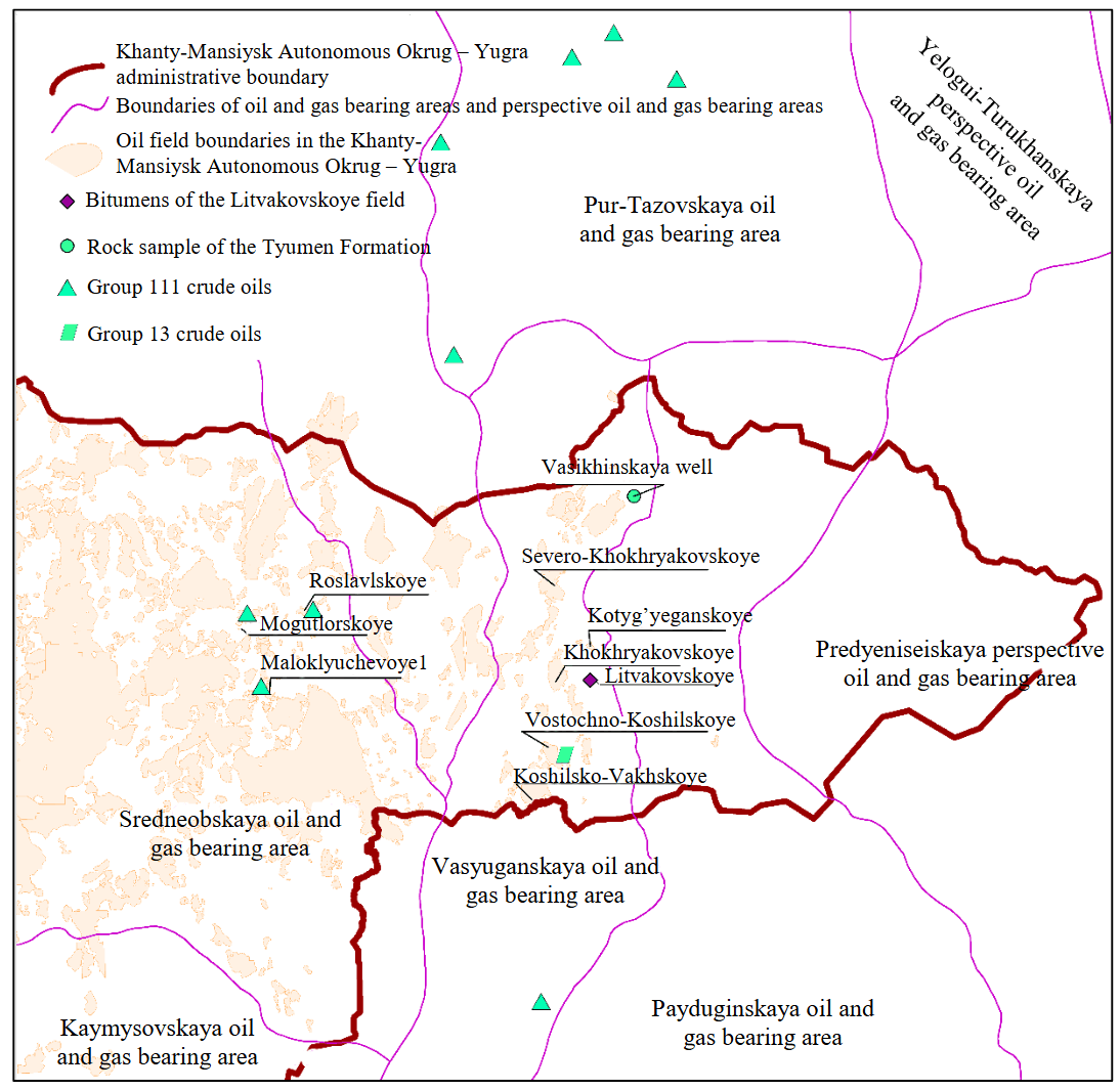 The Litvakovskoye oil field, discovered in 2001, is located in the Nizhnevartovsk District of the Khanty-Mansiysk Autonomous Okrug – Yugra, within the Vasyugan petroleum oil and gas bearing area (Fig.1). In terms of reserves, it is classified as a small field (recoverable/geological reserves: 0.21/0.8 million t), and in terms of geological structure, it is considered simple [1]. At the same time, inclusions of solid bitumen have been discovered in the Upper Permian-Lower Triassic igneous rocks of the pre-Jurassic complex at this field [2, 3]. The origin of these bitumens remains controversial and may be interpreted by researchers from the perspectives of pyrogenic, juvenile, or migration hypotheses [4].