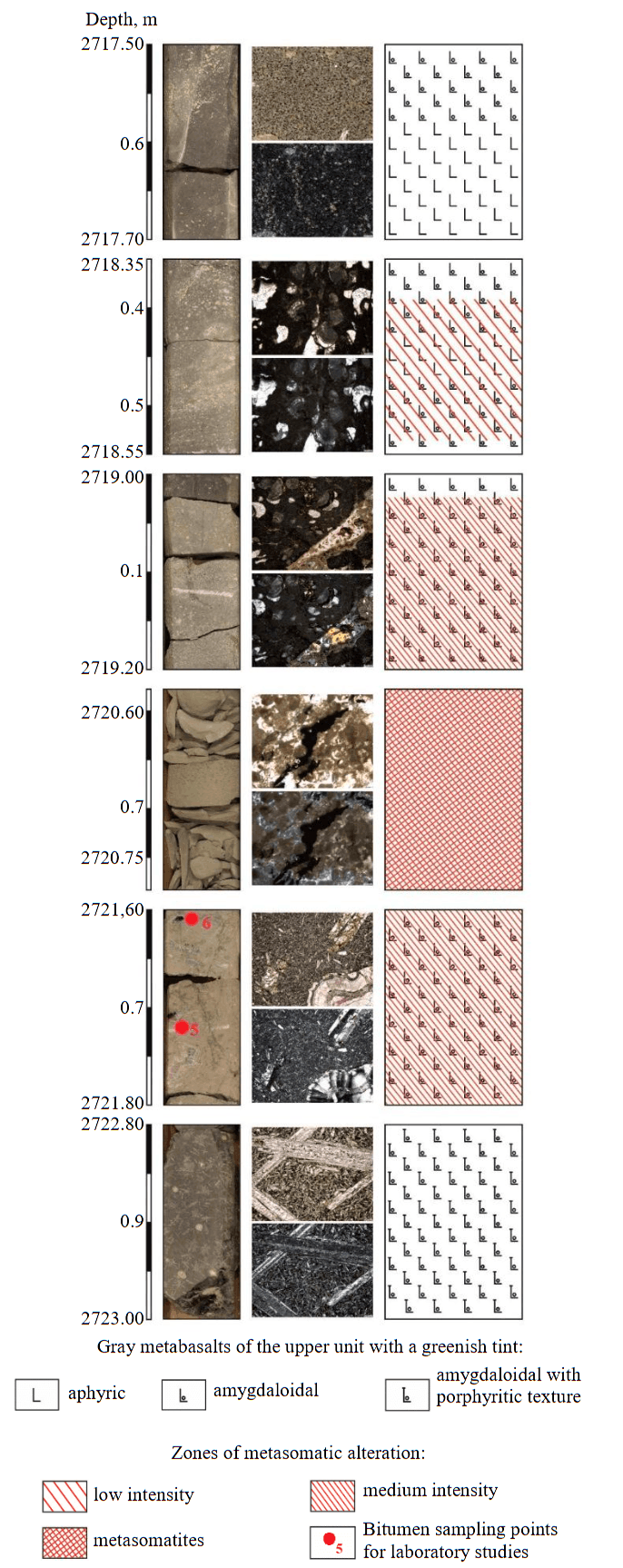 In this study, bitumen segregations within the pore space of basalts from areas of metasomatically altered bleached basalts (Fig.3), directly adjacent to the propylitization zone, were selected for detailed geochemical characterization using chromatographic analytical methods. These correspond to samples 5 and 6 from the depth interval 2721.60-2721.80 m.