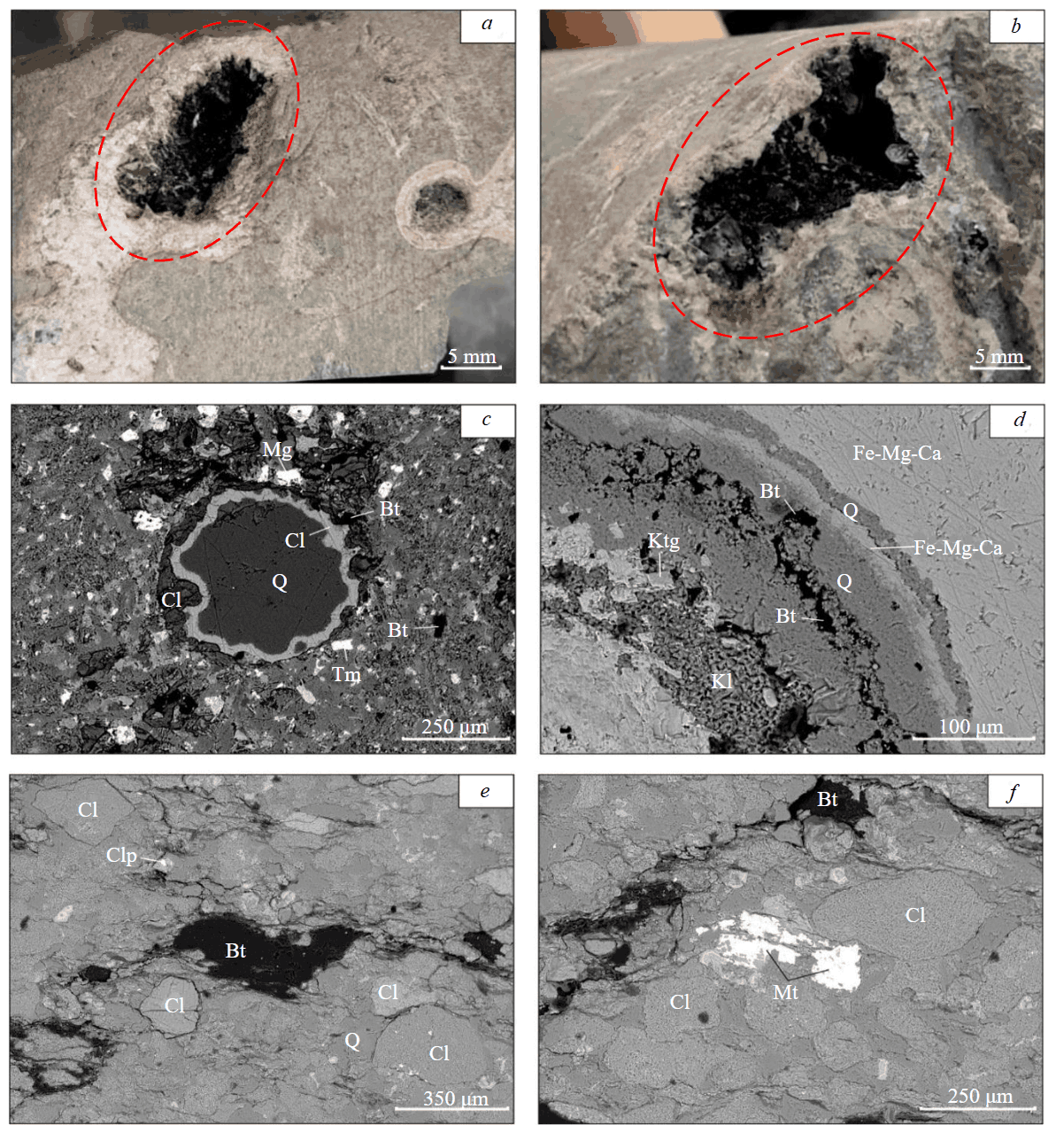 Fe-Mg-Сa – ferromagnesian calcite; Q – quartz; Cl – chlorite; Ktg – kutnohorite; Kl – kaolinite; Bt – bitumen; Tm – titanomagnetite; Mt – magnetite; Clp – chalcopyrite; the red dashed line indicates the bitumen sampling location