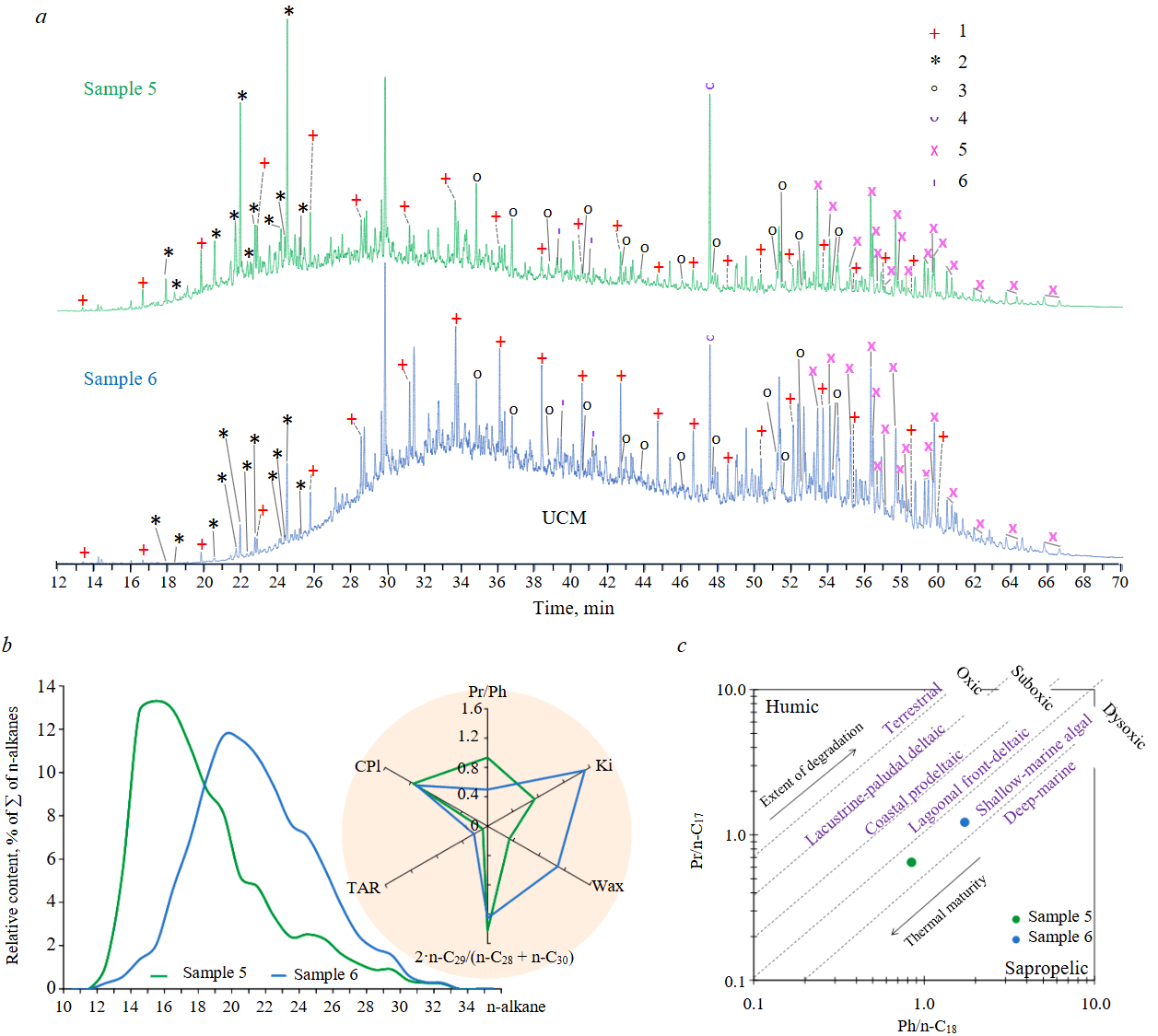 Alkanes Normal alkanes with chain lengths ranging from 12 to 32 carbon atoms, as well as the isoprenoids pristane and phytane, were identified. The molecular weight distributions (MWD) of n-alkanes exhibit unimodal profiles, with maximums occurring in the n-C14-n-C16 range for sample 5 and in the n-C19-n-C21 range for sample 6 (Fig.4, b). The predominance of n-C10-n-C20 alkanes in the MWD of sample 5 indicates a marine origin for the precursor source OM. The slight shift toward higher abundances of n-C21-n-C30 alkanes in sample 6 is likely related to a greater influence of hypergenic factors on its composition, which is also reflected in elevated values of the Wax and Ki geochemical indices, as well as a reduced Pr/Ph ratio (Fig.4, b). Meanwhile, both samples exhibit a distinct predominance of n-C29 alkane over its homologs, which is typically associated with the input of terrigenous OM into the depositional basin. According to the Connan – Сassou diagram (Fig.4, c), the precursor source OM of the bitumens was formed in shallow-water marine settings under reducing conditions.