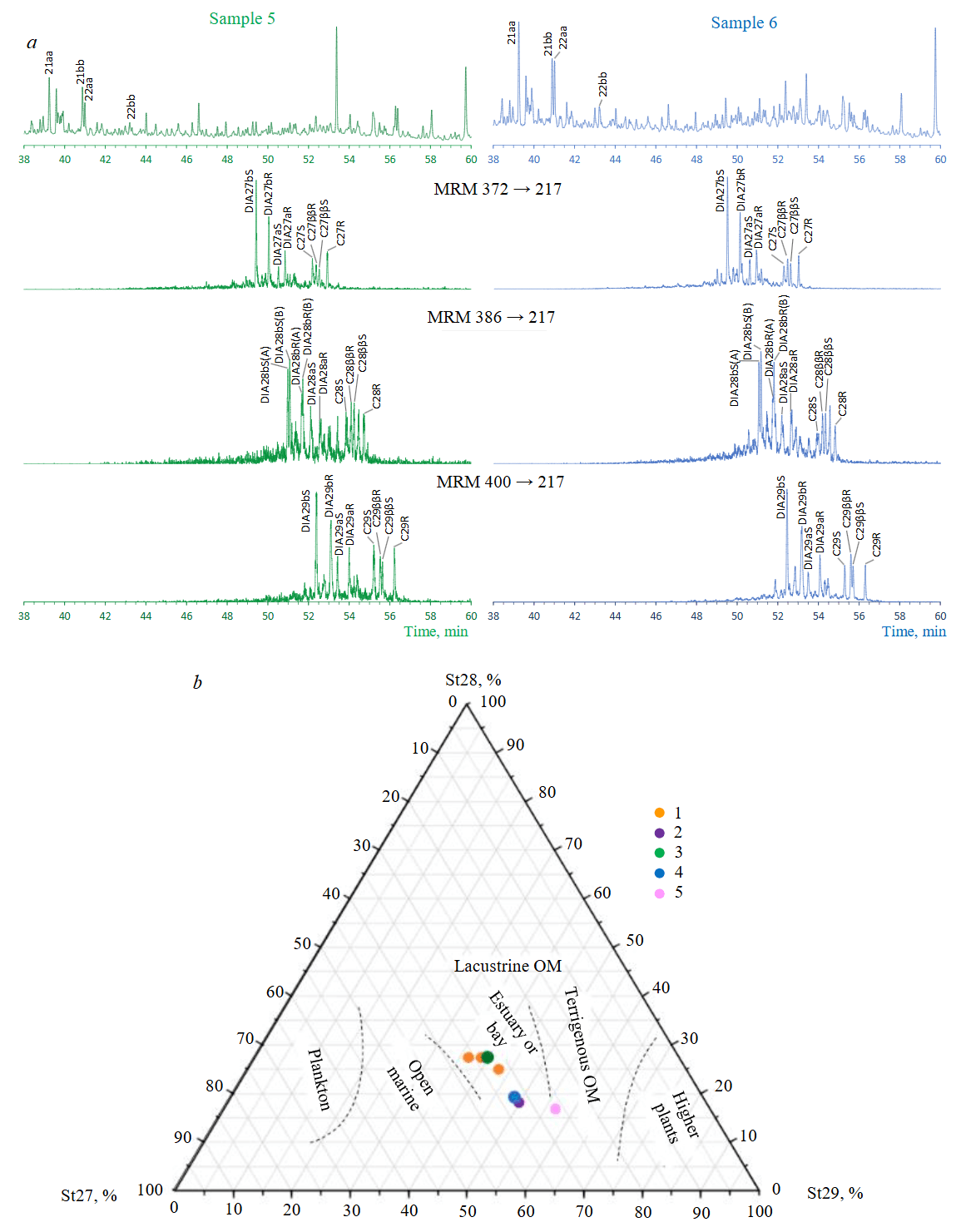Fig.5. Sterane composition: a – mass chromatograms of C21-C22 pregnanes, rearranged (DIA) and regular bio- and geosteranes C27-C29 in SIM and MRM modes; b – determination of genetic types of OM based on the ratio of C27, C28, C29 isosteranes