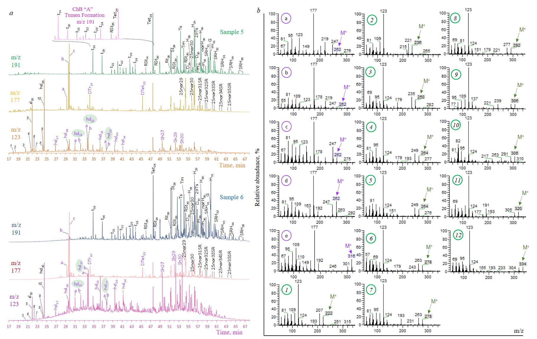 1-10 – bicyclic sesquiterpanes C14-C16; t19-t30 – tricyclic terpanes; Ts – C27 trisnorhopane; Tm – C27 trisnorhopane; 29Ts – C29 trisnorhopane; H28-H35 – hopanes and homohopanes; D29-D30 – diahopanes; m29-m31 – moretanes; G – gammacerane; demethylated 25-nor-: DTr19 (cheilanthane), DTet23 (tetracyclic terpane), C28-C34 hopanes; Sh27, Sh29, Sh30 – secohopanes; hd17-hd24 – bicyclic alkanes; unidentified structures: a, b, c – demethylated 25-nor-C19, 1-12 – bicyclic alkanes hd17-hd24; identified structures: d – demethylated tricyclic terpane DTr19, e – demethylated tetracyclic terpane DTet23