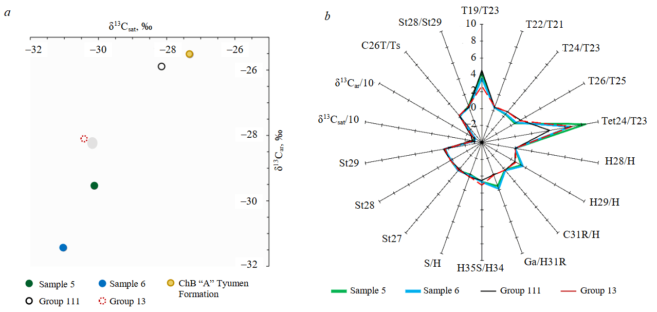 Carbon isotope composition In the PNF and aromatic fraction of sample 5, the content of the heavy carbon isotope 13C is higher compared to sample 6 and is closer to that in the ChB “A” of the Tyumen Formation (Fig.7, a). This may be related to a greater contribution of terrigenous OM transformation products to its composition. Based on the carbon isotope composition, as well as on a number of biomarker parameters in the PNF, the studied bitumens are similar to crude oils of the Tyumen Formation from well 347 of the Koshilskoye field [5], as illustrated in the star diagram in Fig.7, b.