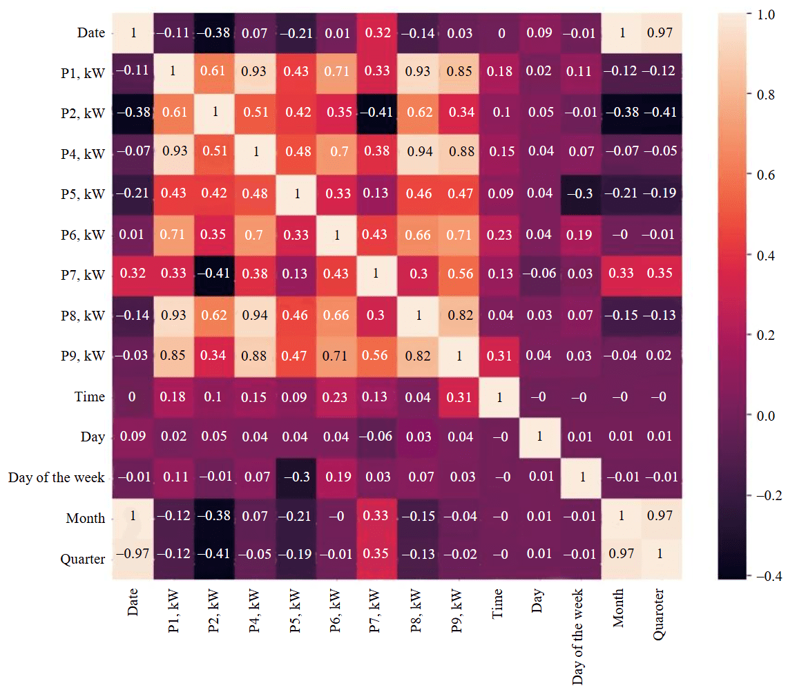- Performing preliminary correlation analysis by calculating Pearson correlation coefficients (Fig.2). This is used to determine the linear relationship between feeders through pairwise comparison.