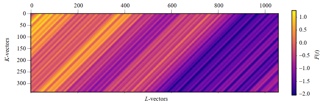 In accordance with the singular analysis method, it is necessary to obtain a trajectory matrix from the initial time series. To do this, the initial time series, which has N values {p1, …, pN}, is embedded in a space with dimension L. In Russian literature, this method of obtaining a trajectory matrix from a time series is called “Gusenica” (eng. Caterpillar), while in foreign literature it is called Embedding. The value L determines the dimension of the trajectory matrix and is called the window length. The procedure for determining the window length is a separate scientific task, but when considering time series with known periodicity, the window length is selected based on the duration of the known period. For example, when analyzing the dependence of solar radiation on time over a weekly cycle, it is advisable to set the window length to be equal to, or a multiple of, one day (the period of the observed cycle). In other cases, additional calculations are required to determine the optimal window size.