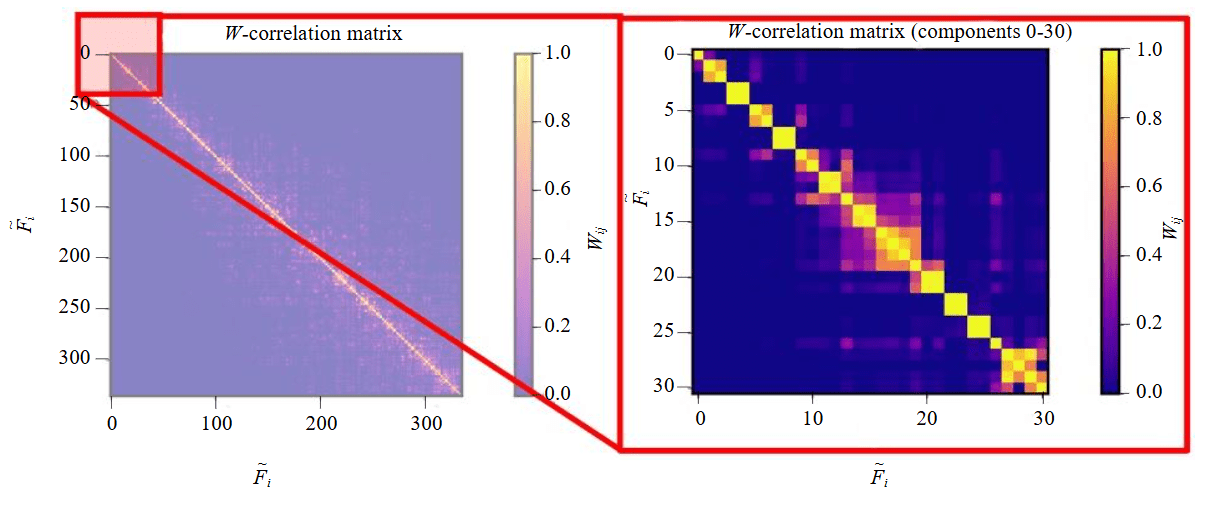 - A W-correlation matrix is constructed to quantify the dependence between the reconstructed components. The components are reordered along the matrix's main diagonal according to their contribution (measured by their singular values) to the total variance of the original time series.