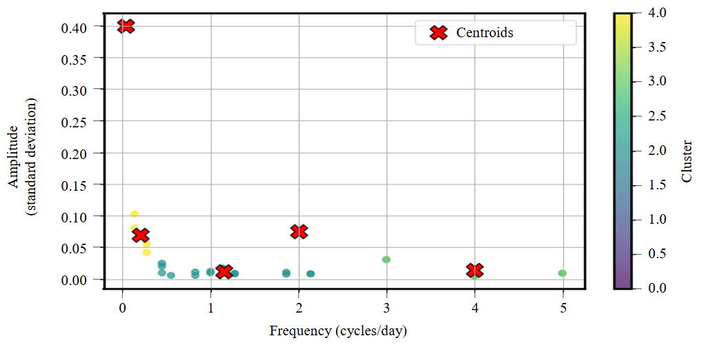 - Analysis of Fig.7 and similar figures with different time intervals revealed that the components cluster in regions of characteristic frequencies. This indirectly indicates a similarity at the component level among consumer groups of the considered feeders. This information can be utilized in various scenarios: from consumption forecasting to generating control actions for electricity demand management algorithms.
