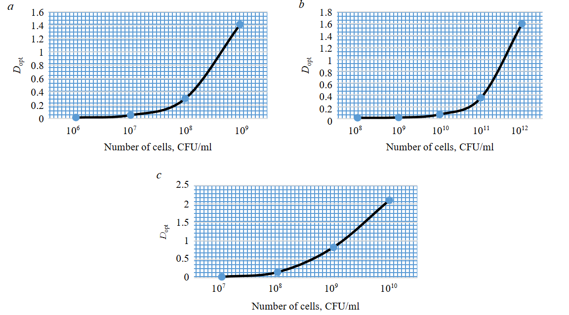To determine the number of cells, bacterial suspensions were prepared by washing them off the surface of the nutrient medium and 10 dilutions of the initial bacterial suspension, for which the optical density was determined on a Hach-Lange DR 5000 spectrophotometer. The number of tubes for the preparation of the initial cell suspension was selected experimentally for each bacterial strain. The cell concentration in the initial suspension was chosen with the condition of non-zero optical density of the suspensions of the latest dilutions, taking into account the nonlinear relationship between the optical density of the suspension and the number of bacterial cells in it. The sowing was carried out using the Drigalsky method. After three days, the number of colonies in Petri dishes for each strain was calculated. Based on the data obtained, calibration curves were constructed, which were used to determine the number of cells in bacterial suspensions (Fig.3).