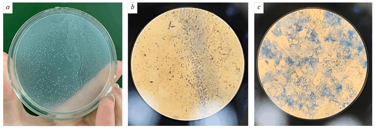 To determine the proportions of strain culture application to the soil, the growth activity of the strains on mineral nutrient media was preliminarily determined in the presence of oil and petroleum products as the only carbon source, including crude oil, diesel fuel, gasoline, and petroleum products from the spill [36]. In the control sample, glucose served as the carbon source. Surface cultivation of the strains was carried out at a temperature of 26±2 °C for seven days. The growth activity of the strains was assessed both visually and by microscopy of fixed preparations (Fig.4).