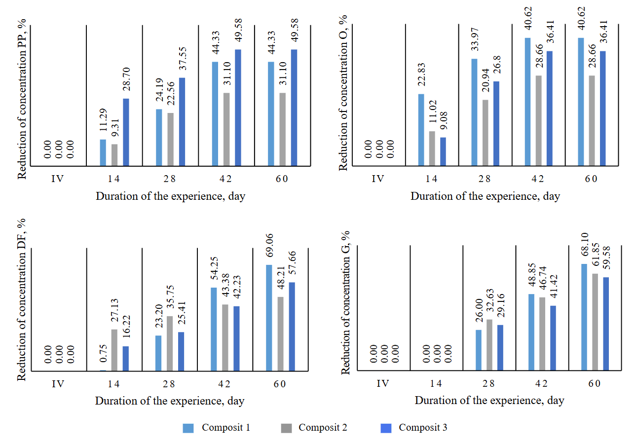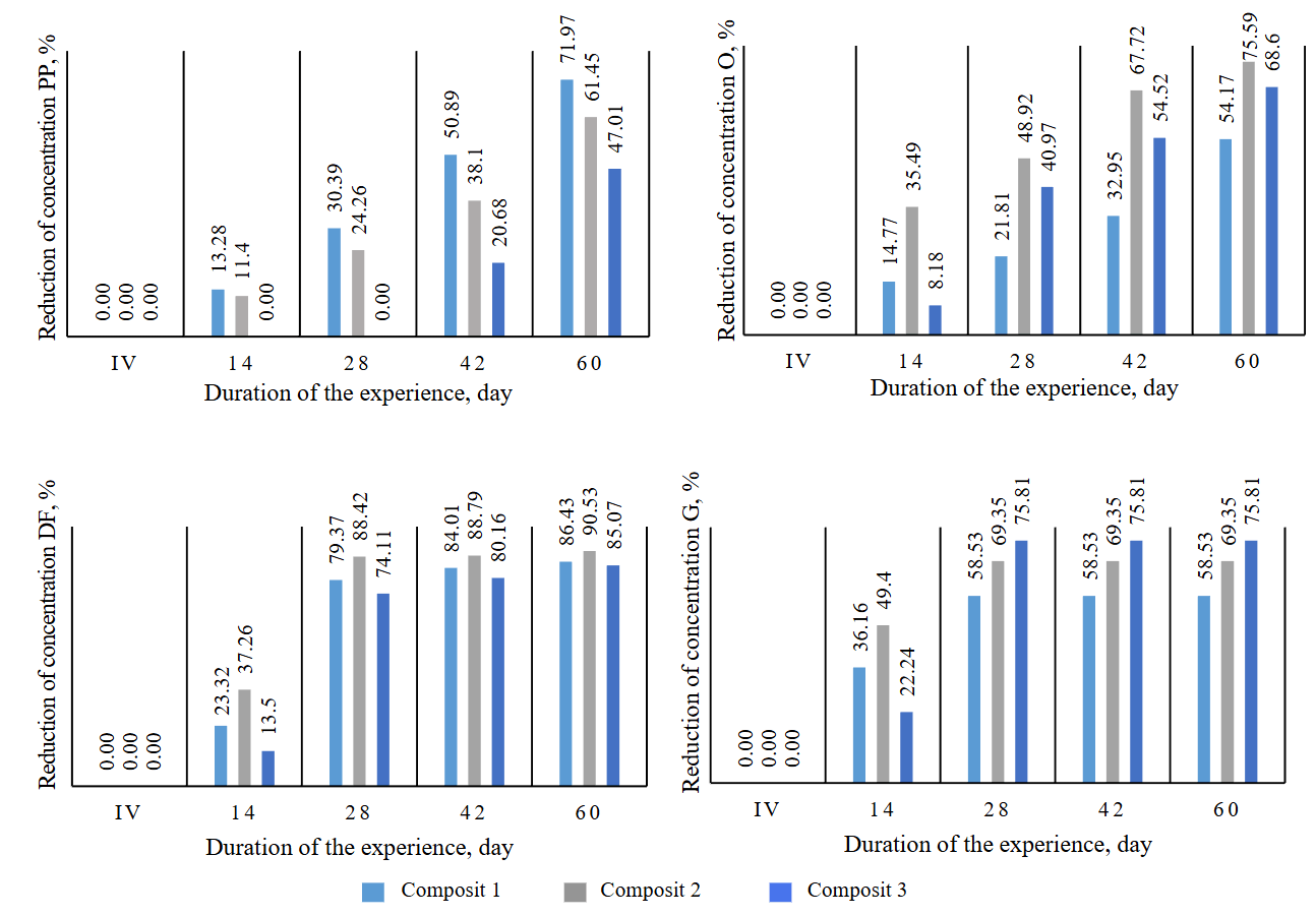 The evaluation of the effectiveness of soil purification from petroleum products using the developed biological product was carried out through mathematical processing of the data obtained. Diagrams reflecting the dynamics of the decrease in the concentration of petroleum products under the action of biologics compositions relative to the initial values (IV) are shown in Fig.5, 6.