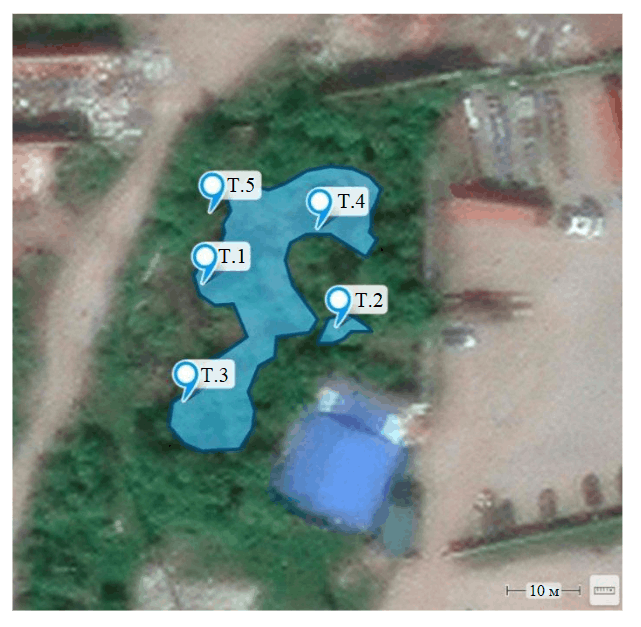 Рис.1. Карта-схема отбора проб почвы. Синий контур – локализация разлива; Т.1-Т.5 – пробные площадки