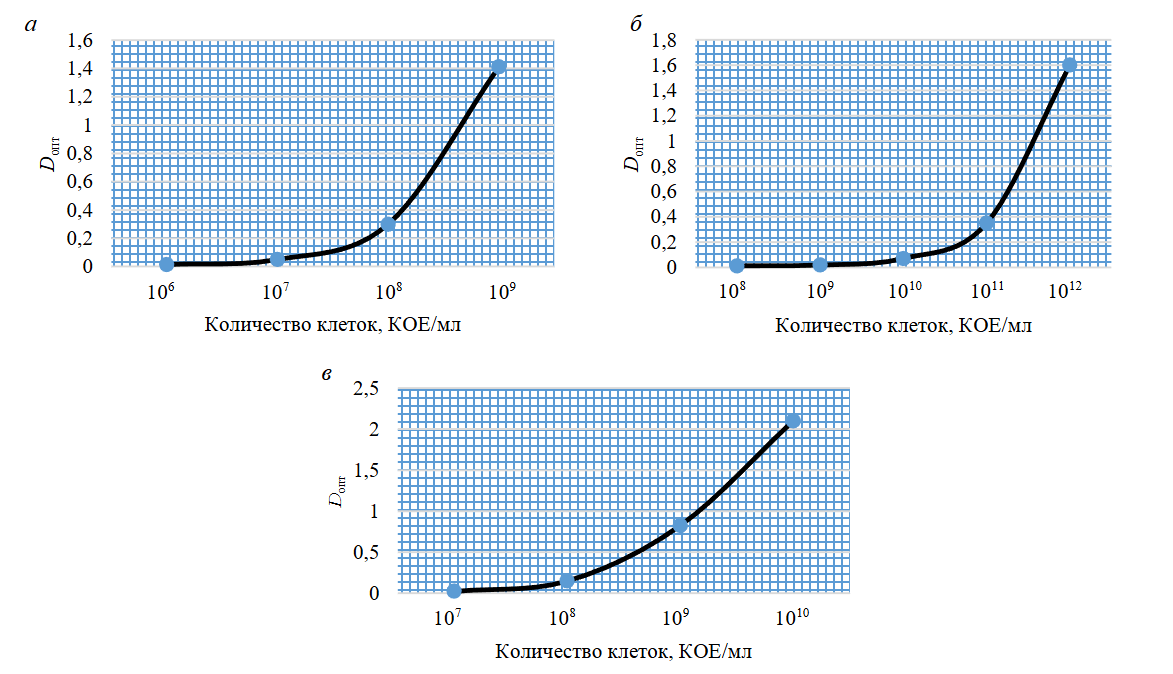 Для определения количества клеток приготовлены бактериальные суспензии методом смыва их с поверхности питательной среды и 10 разведений исходной бактериальной суспензии, для которых на спектрофотометре Hach-Lange DR 5000 определена оптическая плотность. Количество пробирок для приготовления исходной суспензии клеток подобрано экспериментально для каждого бактериального штамма. Концентрация клеток в исходной суспензии выбрана с условием ненулевой оптической плотности суспензий последних разведений с учетом нелинейной зависимости между оптической плотностью суспензии и количеством бактериальных клеток в ней. Посев осуществлен по методу Дригальского. По истечении трех суток произведен подсчет количества колоний в чашках Петри для каждого штамма. На основании полученных данных построены калибровочные кривые, с помощью которых определено количество клеток в бактериальных суспензиях (рис.3).