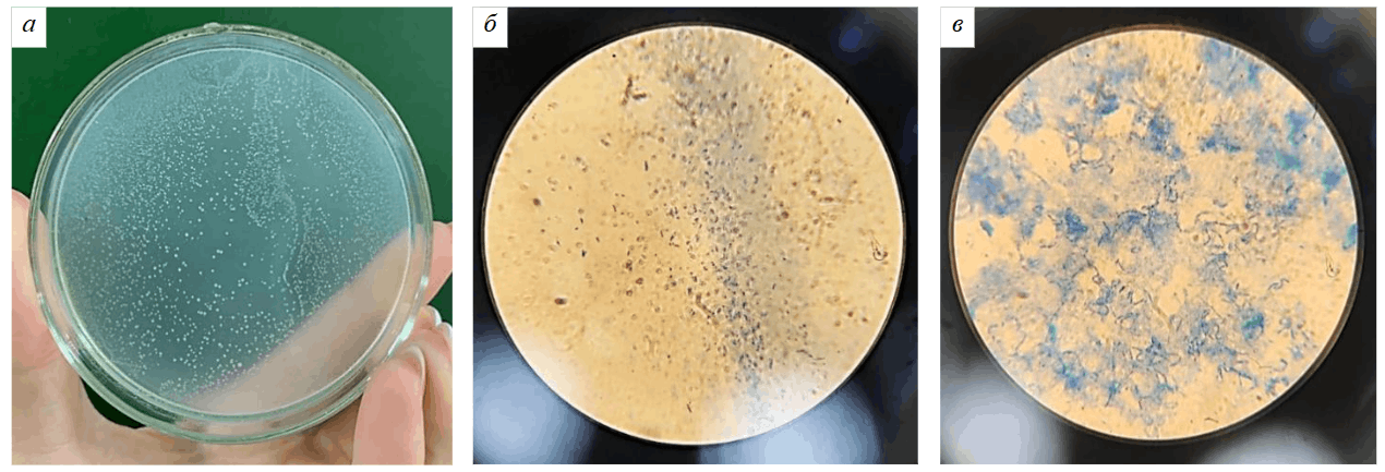 Рис.4. Микроскопические картины клеток штамма 3202 на питательной среде Ворошиловой – Диановой с добавлением источника углерода (а); штамма 858 (увеличение ×400) (б); штамма 1295 на питательной среде с добавлением глюкозы (увеличение ×400) (в)