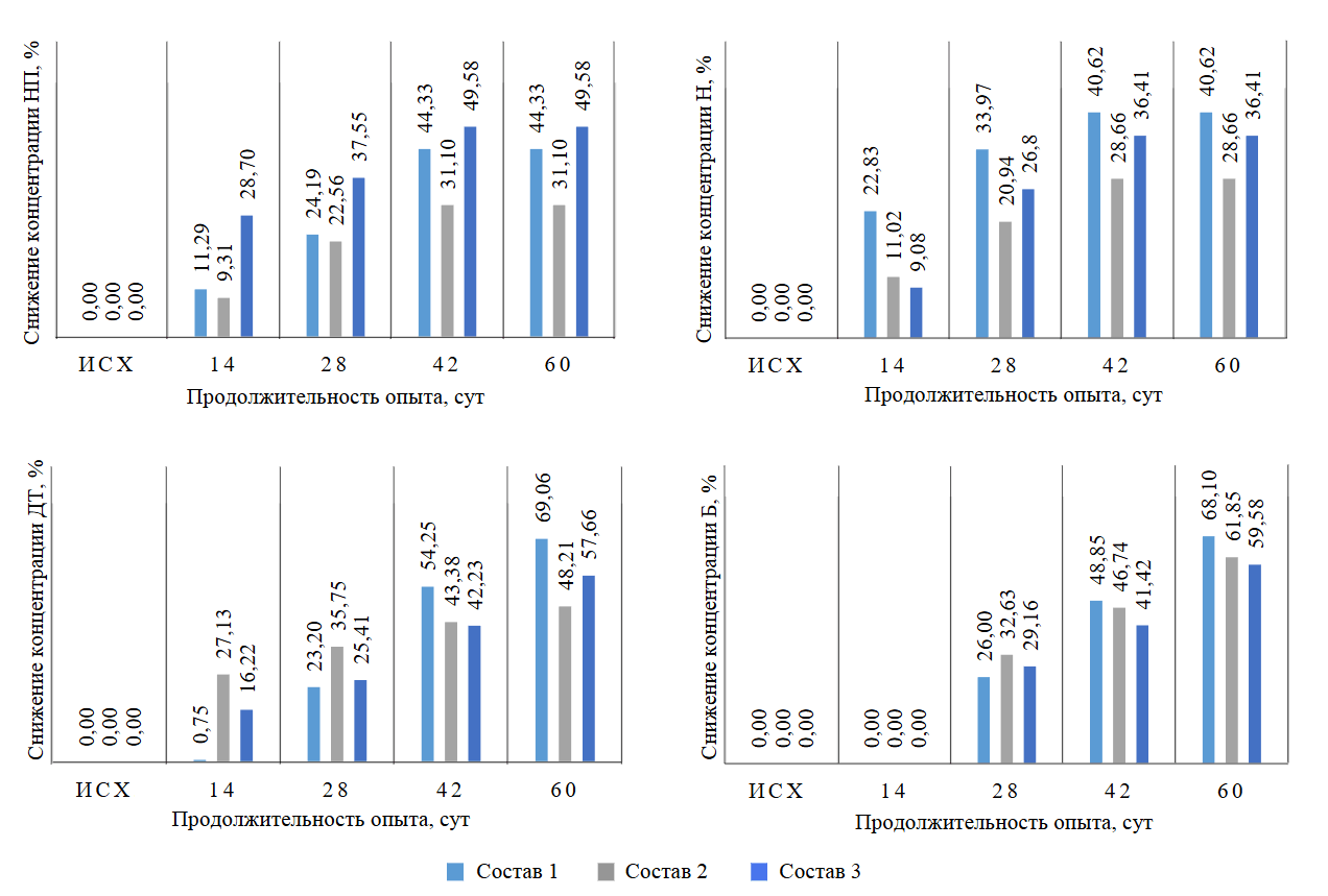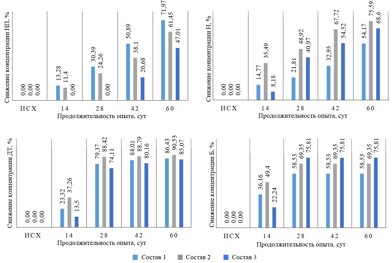 По результатам оценки эффективности очистки нефтезагрязненных почв с внесением разработанного биопрепарата при температурном режиме 20±1 °C и естественной влажности почв спустя 60 сут эксперимента получены следующие максимальные показатели снижения концентрации: для сырой нефти – 75,59 %; для нефтепродукта с разлива – 71,97 %; для дизельного топлива – 90,53 %; для бензина – 75,81 %. При температурном режиме 10±1 °C: для сырой нефти – 40,62 %; для нефтепродукта с разлива – 49,58 %; для дизельного топлива – 69,06 %; для бензина – 68,10 %.