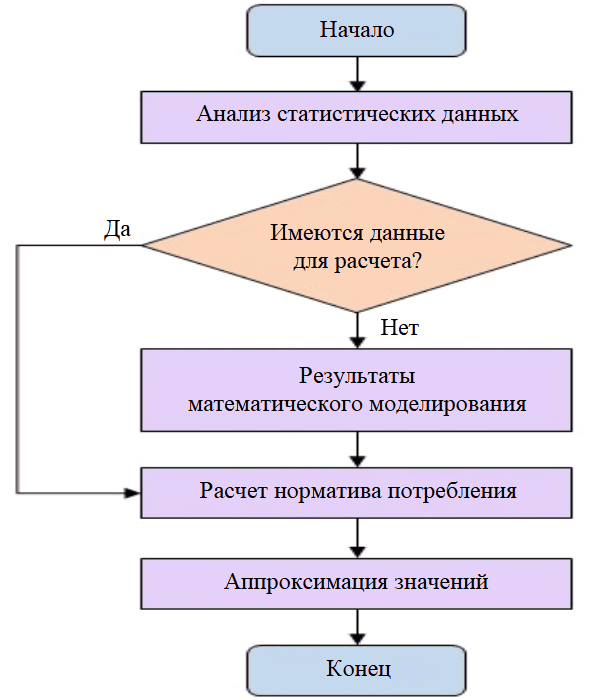 Аппроксимация – научный метод, заключающийся в замене одних математических объектов другими, близкими к исходным [37]. В частности, она является основой для аналитического представления табличных данных функцией заданного вида с неизвестными параметрами, значения которых определяются так, чтобы график функций был по возможности максимально близок к заданным точкам. При проведении аппроксимации для упрощения формул расчета используются степенные полиномы минимальной степени, позволяющей обеспечить необходимую точность расчета. Алгоритм разработки расчетных формул абсолютного потребления технологического оборудования представлен на рис.1. Приведенный алгоритм применяется для каждой единицы оборудования.