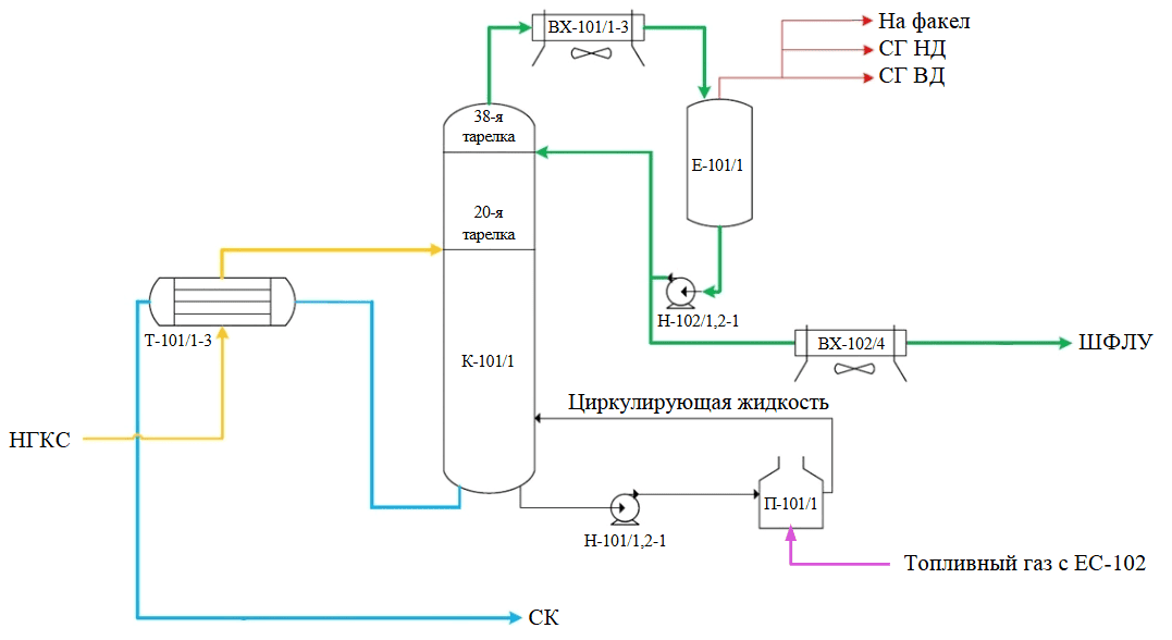 НГКС поступает на технологическую нитку установки из общего коллектора и проходит последовательно трубное пространство теплообменников Т-101/1-3, где нагревается до температуры 80-120 °С обратным потоком стабильного конденсата, выходящим из кубовой части колонны стабилизатора К-101/1. Нагретая до температуры 80-120 °С, НГКС поступает на 20-ю тарелку в средней части стабилизатора К-101/1. Колонна стабилизации К-101/1 предназначена для разделения НГКС на стабильный конденсат (СК) и широкую фракцию легких углеводородов (ШФЛУ) путем ректификации. Колонна К-101/1 представляет собой вертикальный цилиндрический аппарат переменного сечения, внутри которого расположены 38 массообменных клапанных тарелок. Вывод СК производится в сырьевой парк или в линию некондиции.
