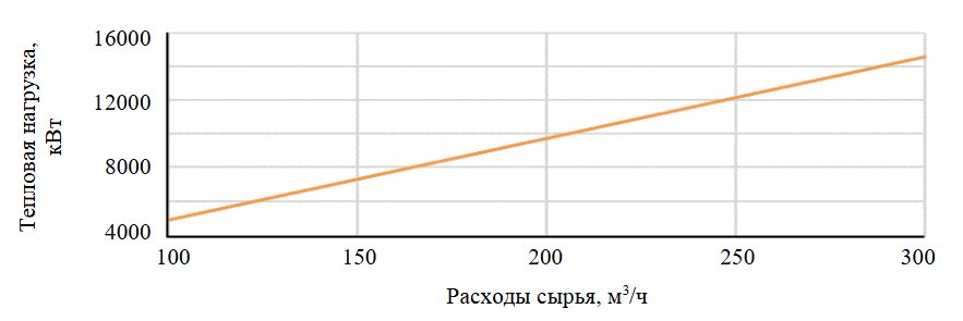 Потребляемая расчетная мощность для электродвигателя вентилятора на стадии разработки проекта должна быть увеличена на 10 % для обеспечения пуска двигателя. В проектной документации расчет производится на максимальную загрузку установки, поэтому не предусмотрен расчет потребляемой мощности АВО в зависимости от загрузки установки. В данном исследовании полученная зависимость позволяет определить значение потребления мощности аппаратом воздушного охлаждения при определенной загрузке установки в конкретный момент времени. Из-за использования двухфазной охлаждаемой среды тепловая нагрузка на аппарат воздушного охлаждения определялась по результатам математического моделирования колонны при различной загрузке установки (рис.3). При расходе сырья 100 м3/ч тепловая нагрузка составляет 252,9 (4860) кДж/кг (кВт); при 150 м3/ч тепловая нагрузка 252,8 (7290) кДж/кг (кВт); при 200 м3/ч тепловая нагрузка 252,8 (9718) кДж/кг (кВт); при 250 м3/ч тепловая нагрузка 252,7 (12145) кДж/кг (кВт); при 300 м3/ч тепловая нагрузка 252,97 (14570) кДж/кг (кВт);