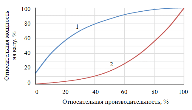 Рис.4. Типовая зависимость потребляемой мощности вентилятора от его производительности