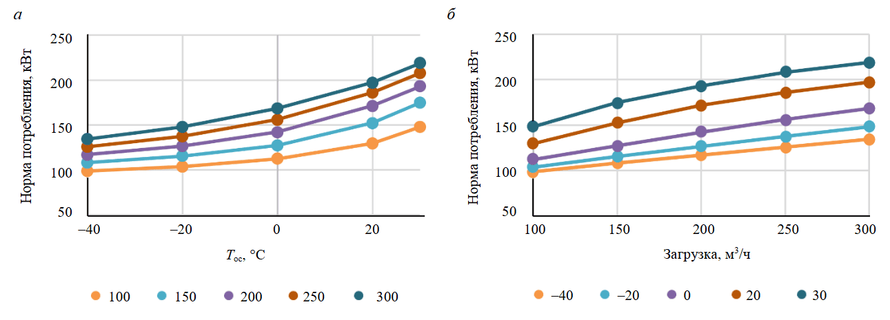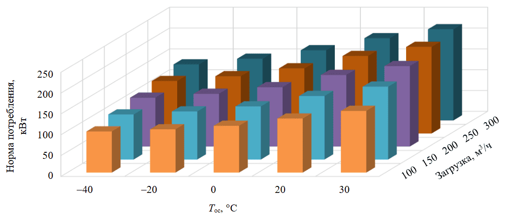 Полученная зависимость позволяет вычислить значение потребления мощности аппаратом воздушного охлаждения в конкретный момент времени. Дополнительно проведен анализ чувствительности модели к входным данным. При проверке модели на основе тестовых значений по загрузке установки (расходу сырья) и изменения температуры окружающей среды для расчетного периода было выявлено, что при различных комбинациях погрешности в задании температуры окружающей среды на ±2 °C и/или расхода сырья на ±5 % изменение расчетного значения норматива потребляемой мощности составило до 1,5 %.