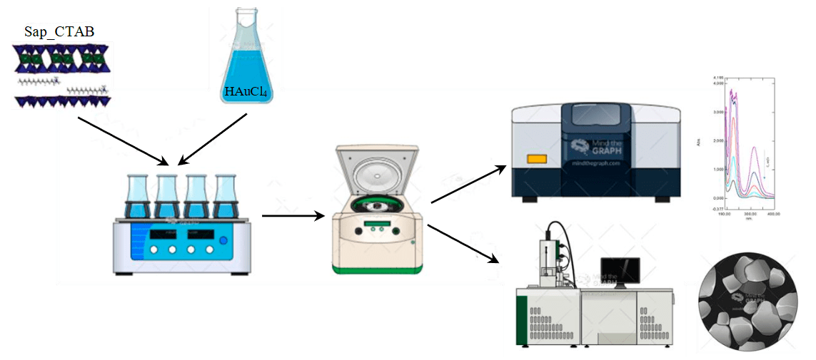 Structural and textural features and material composition of the surface of gold-saturated modified saponite were investigated using a LEO scanning electron microscope (1420VP INCA 350, Zeiss). The interplanar spacing of saponite was determined by X-ray diffractometry (XRD 7000, Shimadzu). The zeta potential of the source and modified saponites was studied in distilled water (pH 6.5) on 0.5 g subsamples after preliminary ultrasonic dispersion using a Nanosizer Zeta Pro analyser (919S, Opptronix). Fourier transform IR spectroscopy was performed on an IR-Affinity spectrometer (Shimadzu). The results were processed by mathematical statistics methods and OriginPro 2018 and Microsoft Excel.