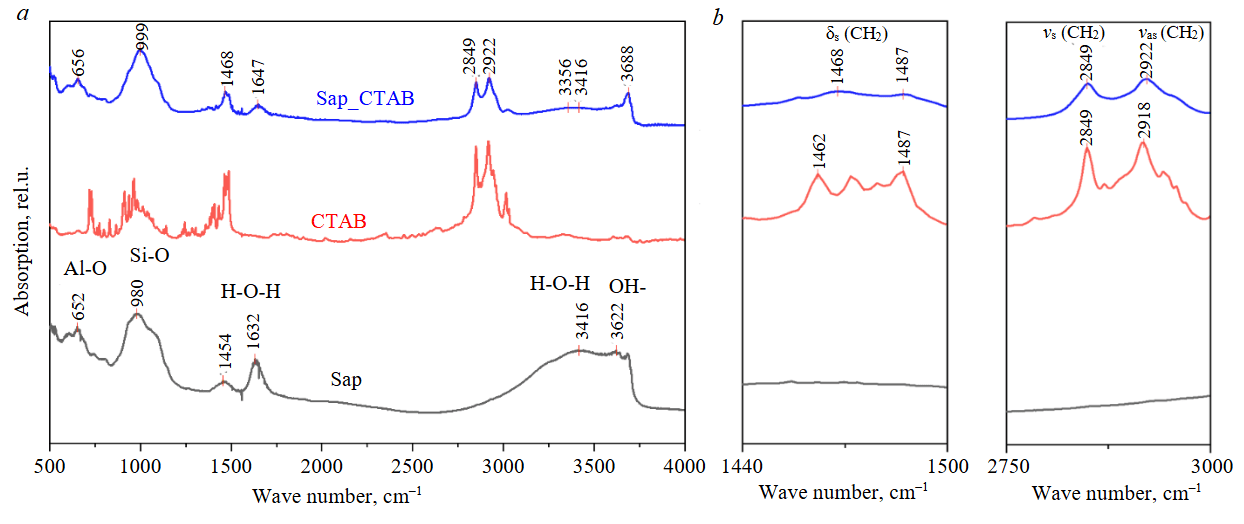 In IR spectra of modified saponite (Fig.5, a) the appearance of bands in the spectral ranges of 1460-1490 and 2850-2920 cm–1 (Fig.5, b) attributed to deformation and stretching vibrations of the CH2 group, respectively, was recorded [37, 38].